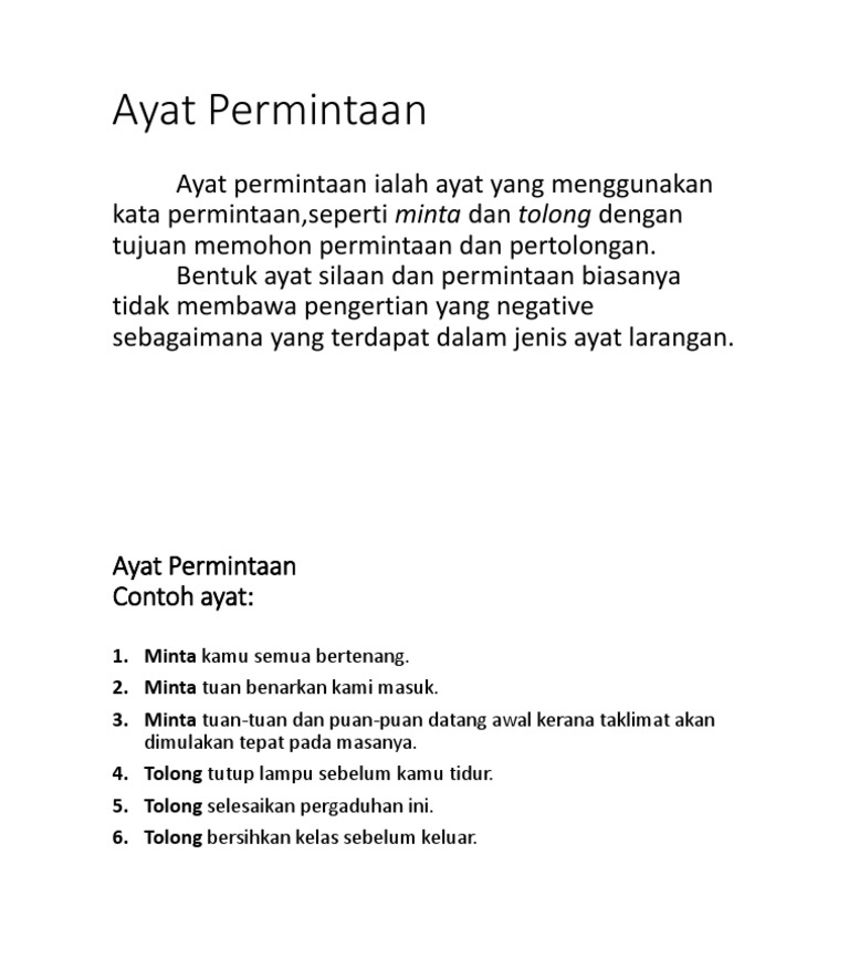 B memohon pertolongan atau permintaa dari seseorang. Ayat suruhan dan ayat permintaan. Ayat permintaan ialah ayat yang menggunakan kata permintaan seperti minta dan tolong dengan tujuan memohon permintaan dan pertolongan.